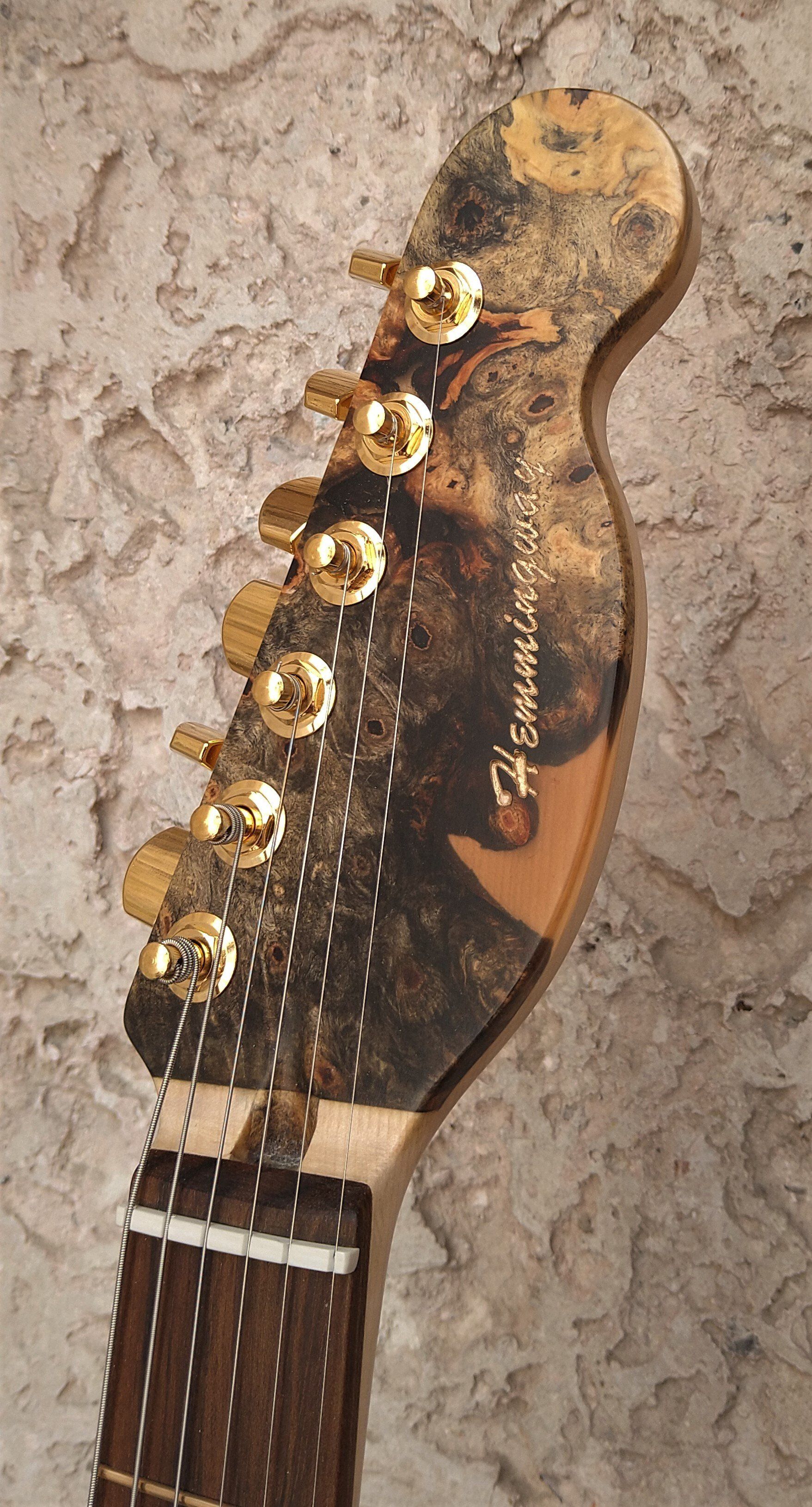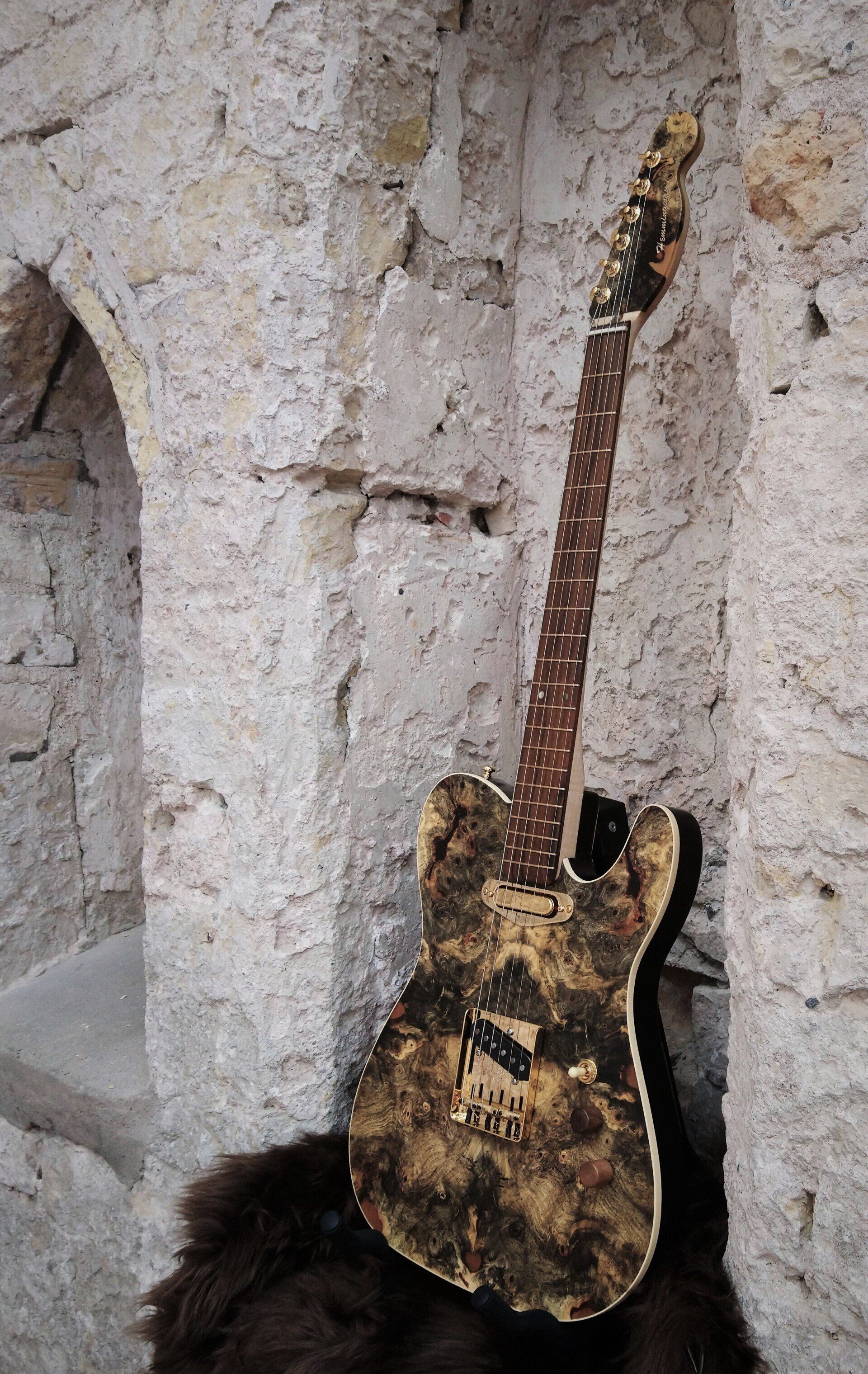 The body is made of red alder with a buckeye burl top, the gold-coloured fittings give that extra luxurious look.
