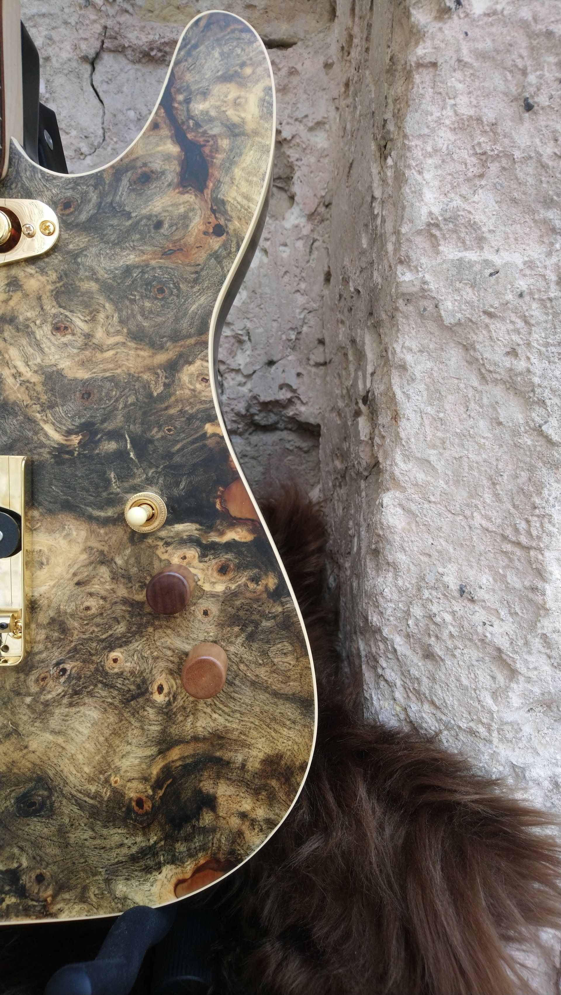 The body is made of red alder with a buckeye burl top, the gold-coloured fittings give that extra luxurious look.